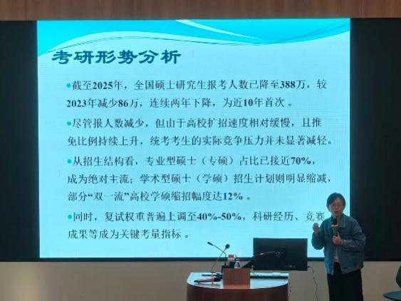 2025年10月27日下午,国交楼312教室顺利开展《考研数学复习全程规划》讲座,本次讲座由学院资深教师贾俊晶主讲,吸引全校90余名学生参与。旨在帮助全校学生明晰考研数学复习方向,高效备战硕士研究生考试。