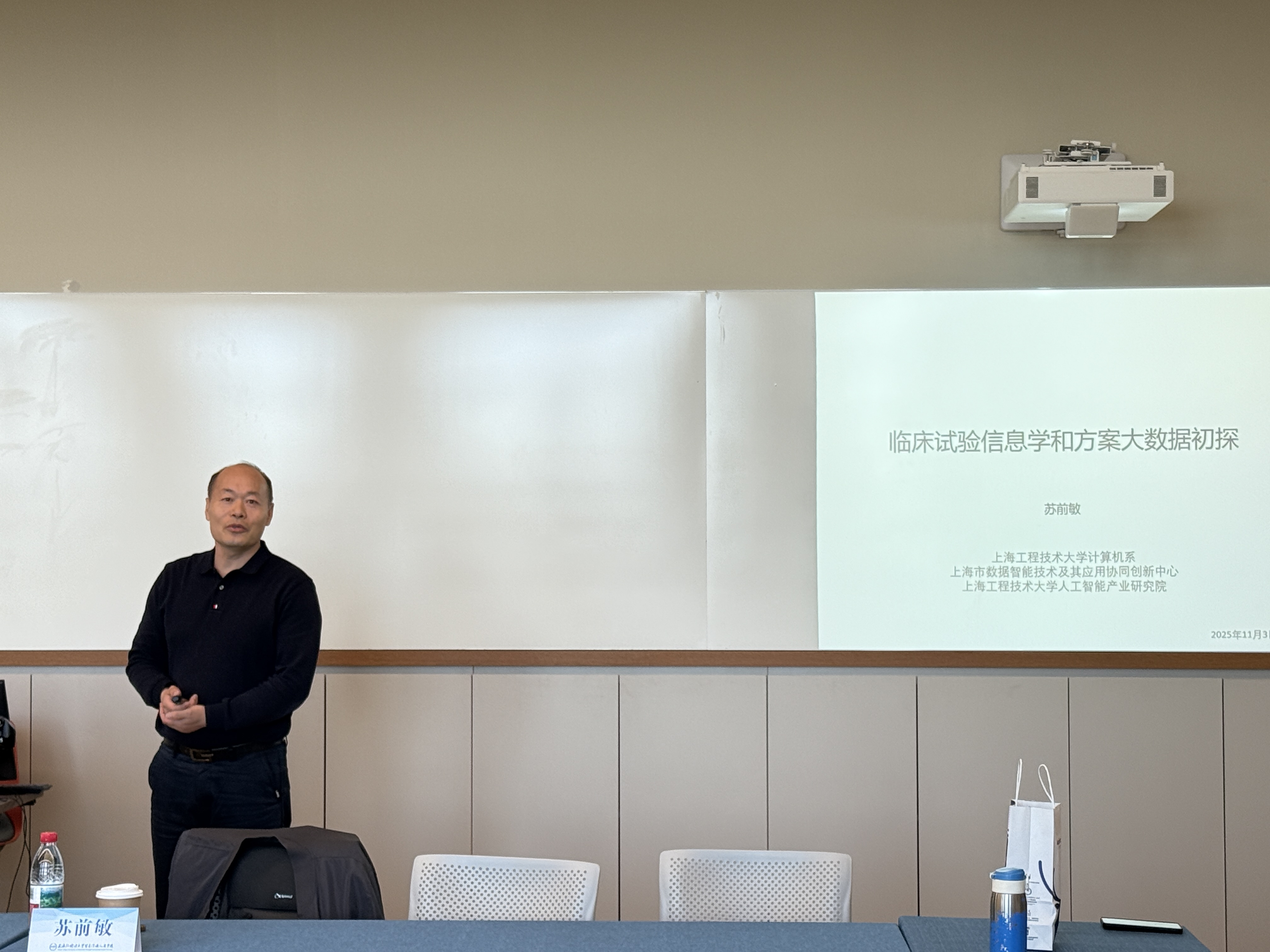 上海工程技术大学苏前敏教授分享的专题是:临床试验信息学和方案大数据初探,他就健康医学大数据分类及应用、新药研发、纳排标准、运用知识发现技术建立乳岩诊治文献数据库、出土简帛医方显示系统、基于肝癌的知识图谱构建及知识服务系统架构与实现等方面进行了深入的交流,给教师们打开了人工智能与大数据在医疗领域应用研究的思路。