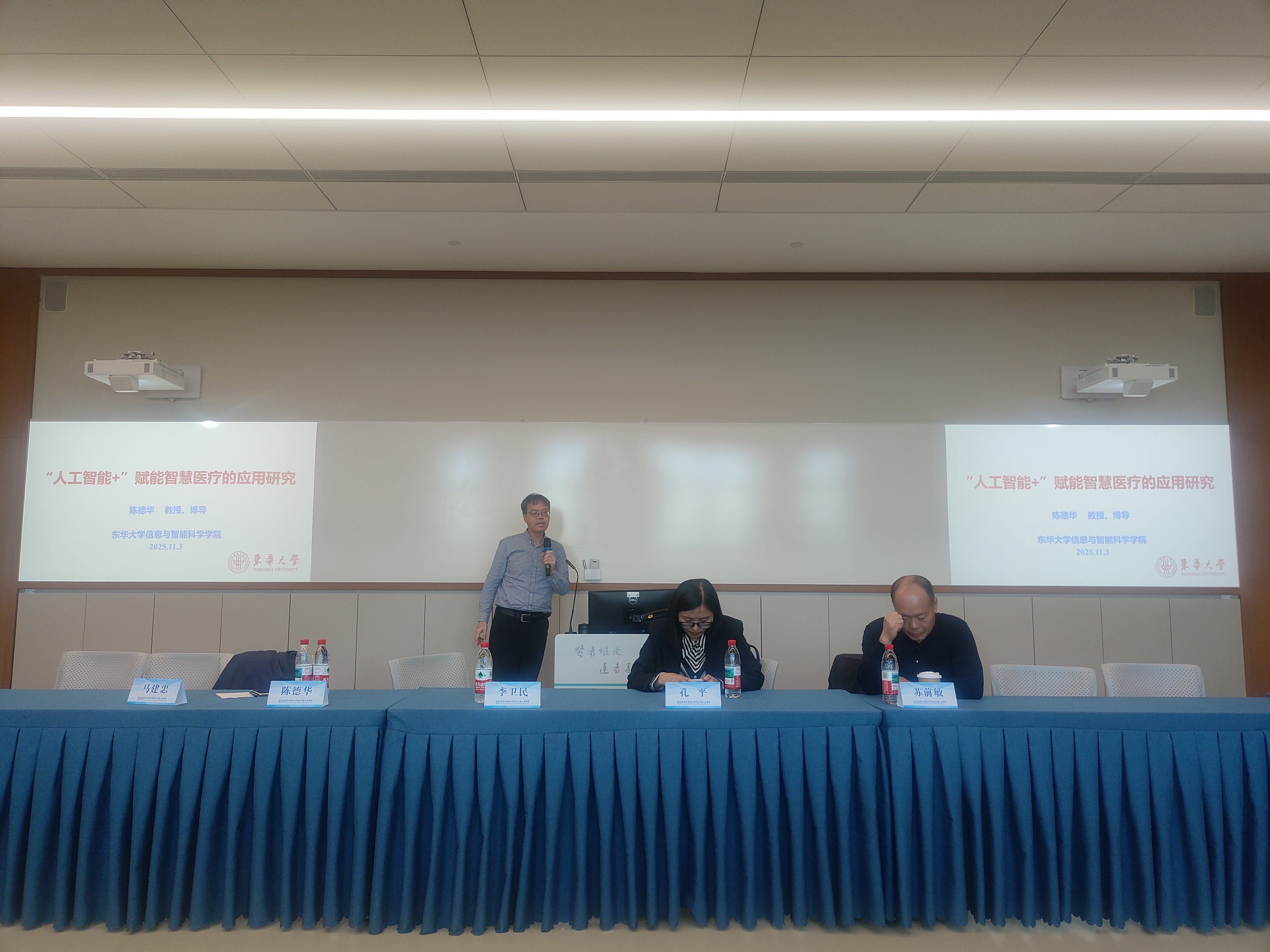 东华大学的陈德华教授分享的专题是:“人工智能+”赋能智慧医疗的应用研究,他结合自己的研究路径和研究感悟,就智慧医疗科研基地建设、“人工智能+”医疗健康应用研究两个大方向展开了饶有兴趣的专题交流,并分享了与万达信息股份有限公司、上海交通大学医学院附属瑞金医院、上海申康医学发展中心、上海市第一人民医院、上海市第六人民医院、复旦大学附属华山医院、上海市五官科医院、中南大学湘雅二医院成功合作的经验。陈教授多年来,一直与各大医院临床医生保持着紧密的合作,主持过多项国家重点研发计划项目和省部级研发项目,成果斐然,他的分享老师们留下了深刻的印象,也为老师们提供了卓有成效的的研究方法。