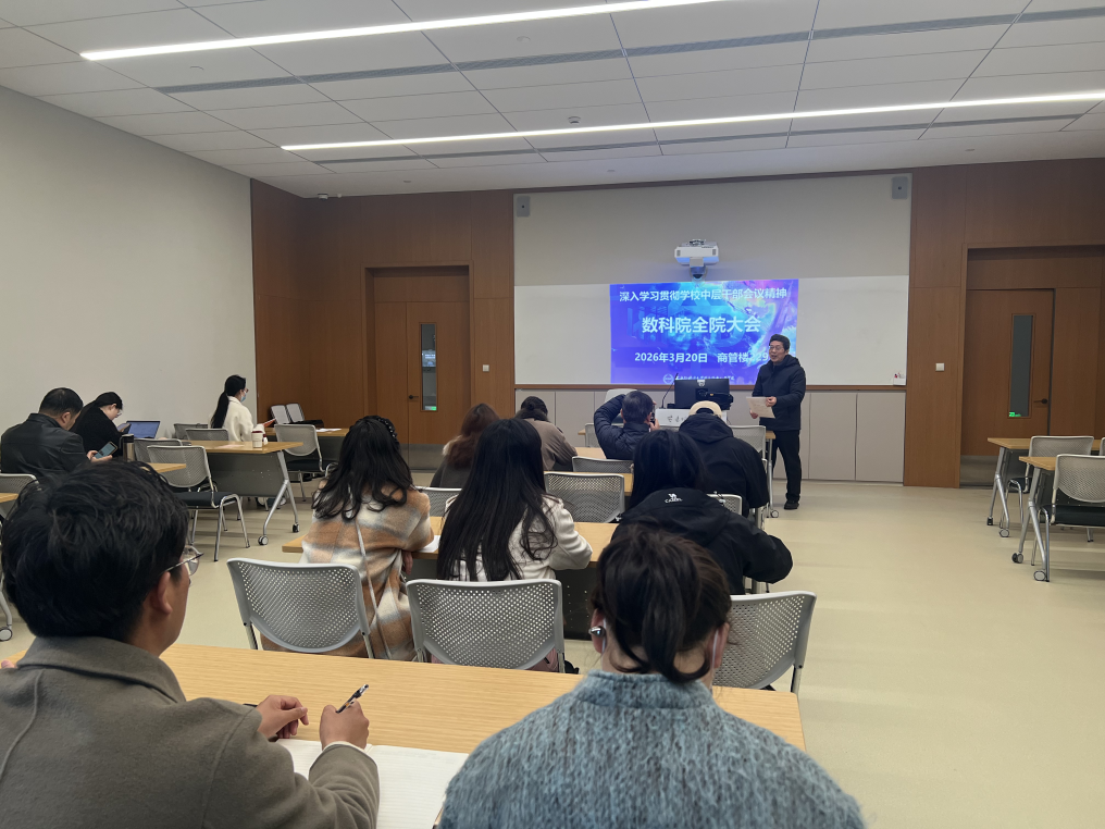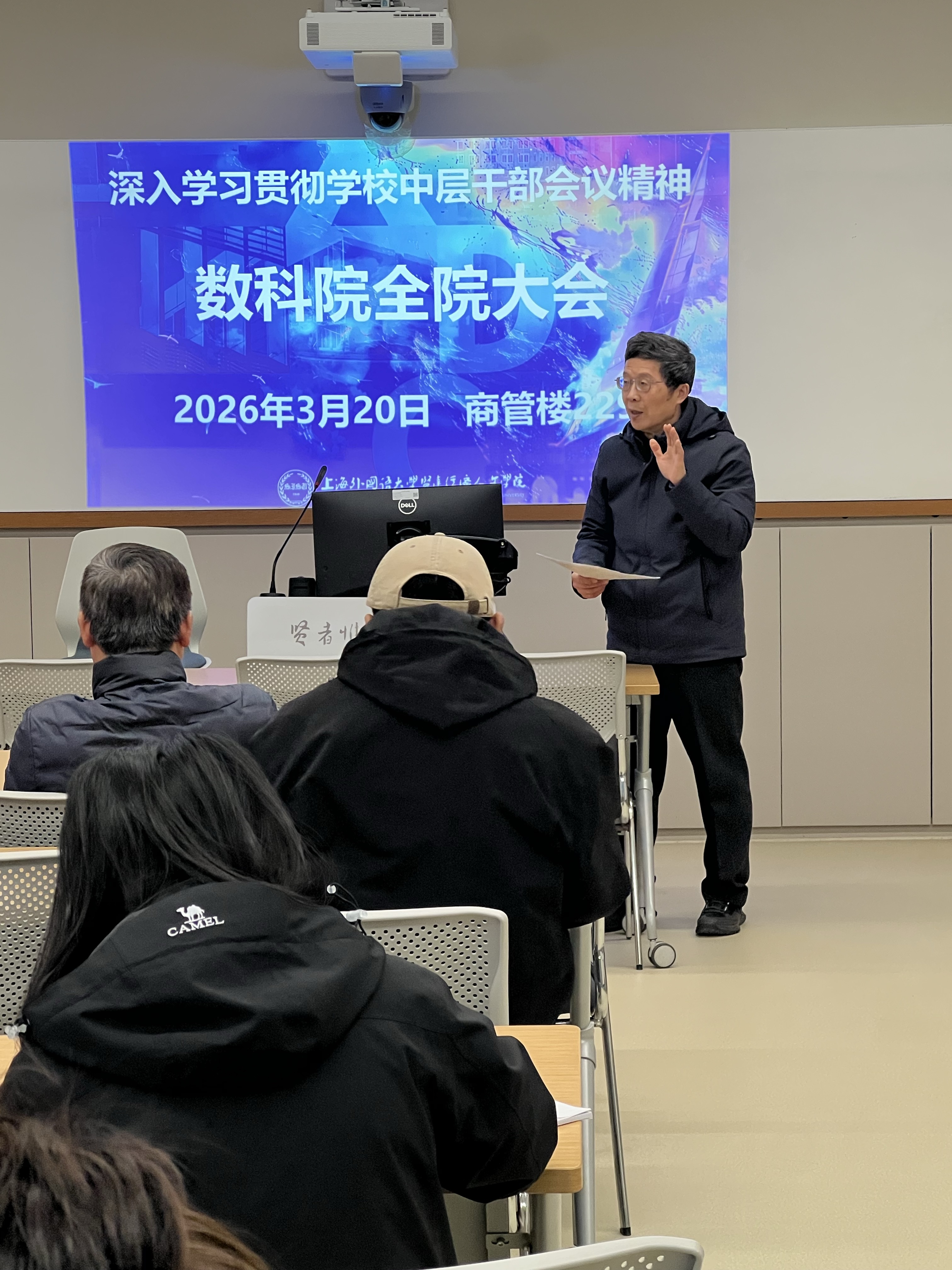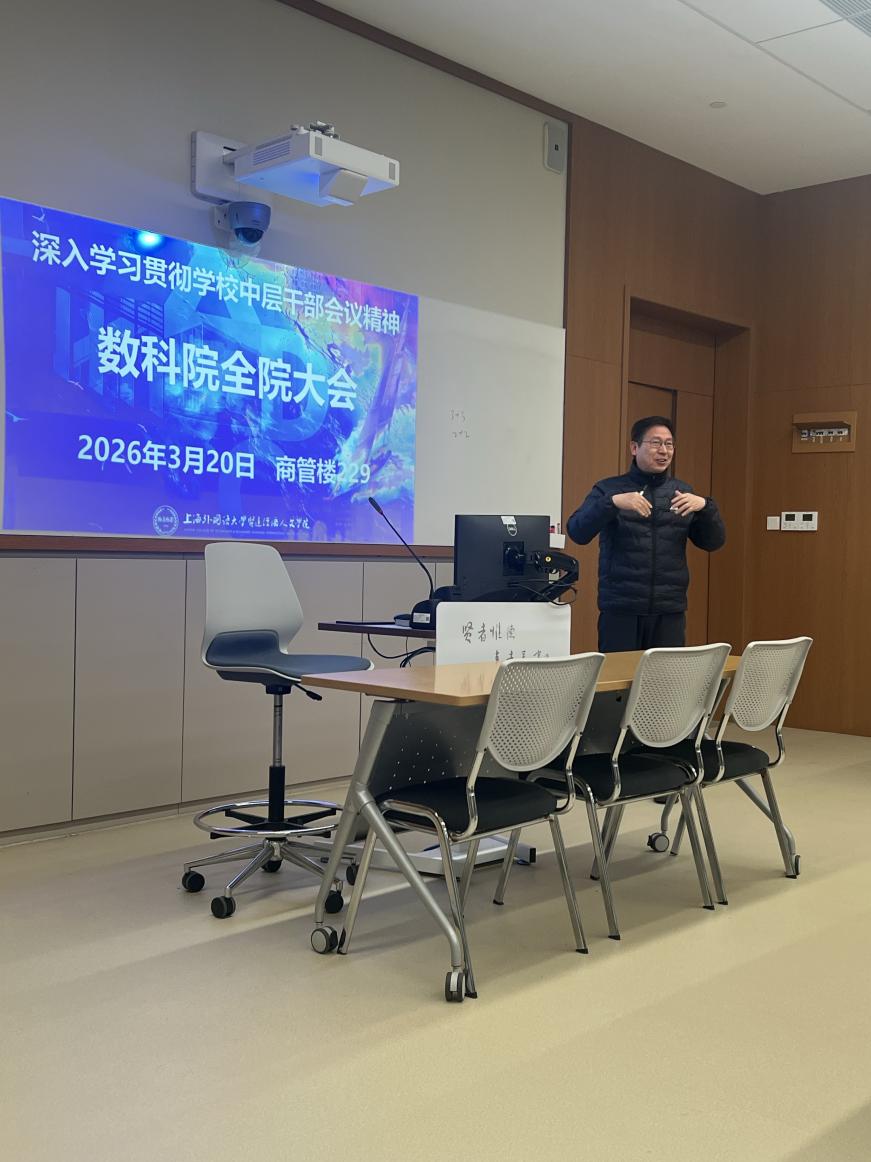 3月20日上午9:30,数据科学学院在崇明校区商管楼229召开全院大会,专题学习《上海外国语大学贤达经济人文学院2026年工作要点》及董事长在全面深化教育综合改革暨2026年重点工作会议上的重要讲话精神。会议由院长主持,学院领导班子及全体教职工参加。